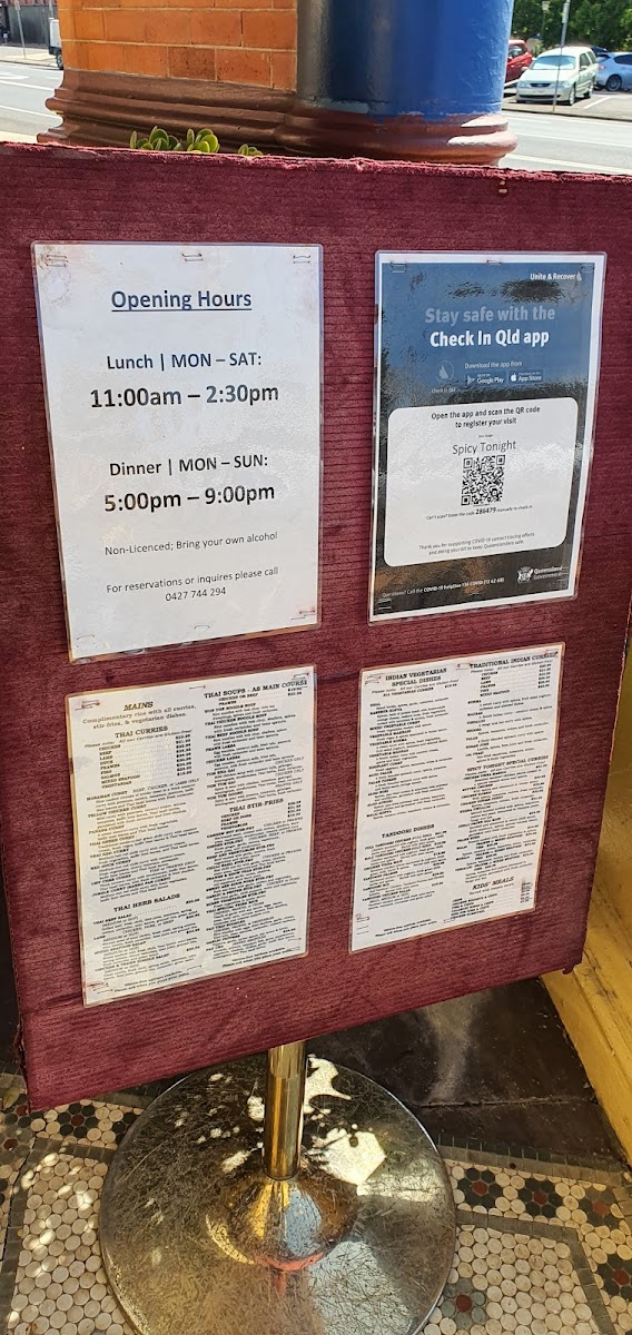 Dining at Spicy Tonight on 1 Targo St, Bundaberg Central, offers a vibrant menu that brilliantly fuses Indian and Thai flavors, appealing to both spice enthusiasts and casual diners. The starters impress with options like Fish Pakora, Onion Bhaji Pakora, Tom Yum Goong Ent, Tom Yum Gai Ent, and Chicken Samosa (2), setting the stage for a bold culinary journey. For those drawn to tandoori delights, the menu features Tandoori Prawns, Tandoori Chicken Salad, Half Tandoori Chicken, Tandoori Mix, and Chicken Tikka Main, each promising smoky, succulent flavors. Freshness shines in the Thai Herbs Salads such as Larb Salad, Mixed Seafood Salad, Chicken And Prawn Noodle Salad, and Thai Beef Salad, while the stir-fry section offers crowd-pleasers like Thai Special Fried Rice, Pad Cha (Mixed Seafood), Pad Thai Noodles, Chili Basil Stir Fry (Pad Kapao), and Cashew Nut Stir Fry. Complementary sides including Coconut Rice, Hot Lime Pickles, Mango Chutney, Tomato And Onion Salad, and Saffron Rice round out the experience, alongside an extensive array of Indian breads like Cheese And Chicken Naan, Keema Naan, Roti Naan, Cheese And Garlic Naan, and Cheese And Olive Naan. Vegetarian diners can indulge in classics like Vegetable Madras, Kashmir Kofta, Dhal, Aloo Gobi, and Palak Paneer, while the curry offerings cover traditional favorites including Jalfrezi, Palak, Vindaloo, Madras, and Rogan Josh, as well as signature dishes such as Keema Vindaloo, Butter Chicken, Masala Chili Prawn Goa Main, and Chicken Karahi. Thai curries like Jungle Curry (Kaeng Par Curry), Thai Red Curry, Red Duck Curry, Yellow Chicken Curry, and Panang Curry provide fragrant, spicy options, complemented by warming soups including Tom Yum Gai Main, Thai Chicken Noodle Soup, Tom Yum Goong Main, Tom Kha Gai Main, and Wonton Noodle Soup. Overall, the menu at Spicy Tonight is a thoughtfully curated blend of bold spices, fresh ingredients, and diverse regional specialties, offering something memorable for every palate.